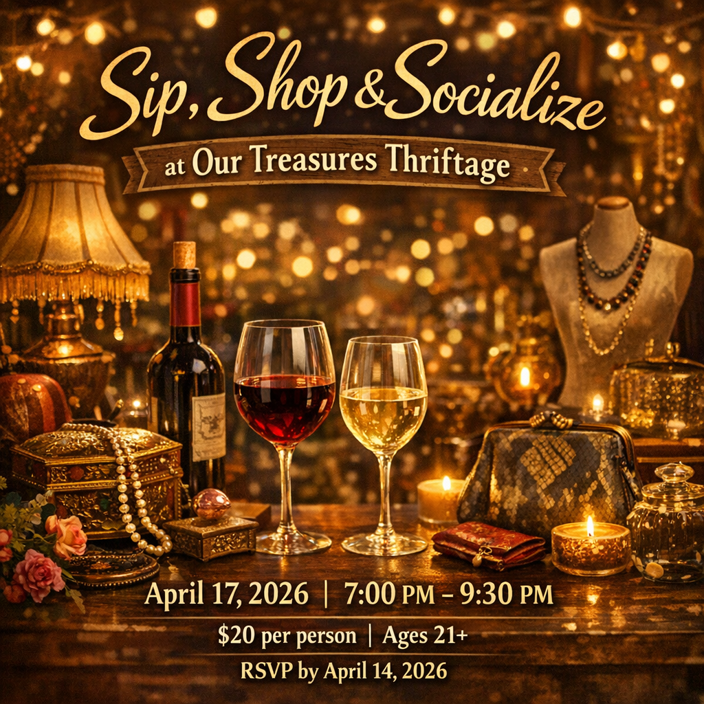 Join us for an exclusive evening at Our Treasures Thriftage — a cozy, adults‑only night of sipping, shopping, and socializing. Discover unique treasures, enjoy curated beverages, and connect with fellow vintage lovers in a relaxed, festive setting. This RSVP‑only event offers a limited number of spots to keep the experience personal and enjoyable.